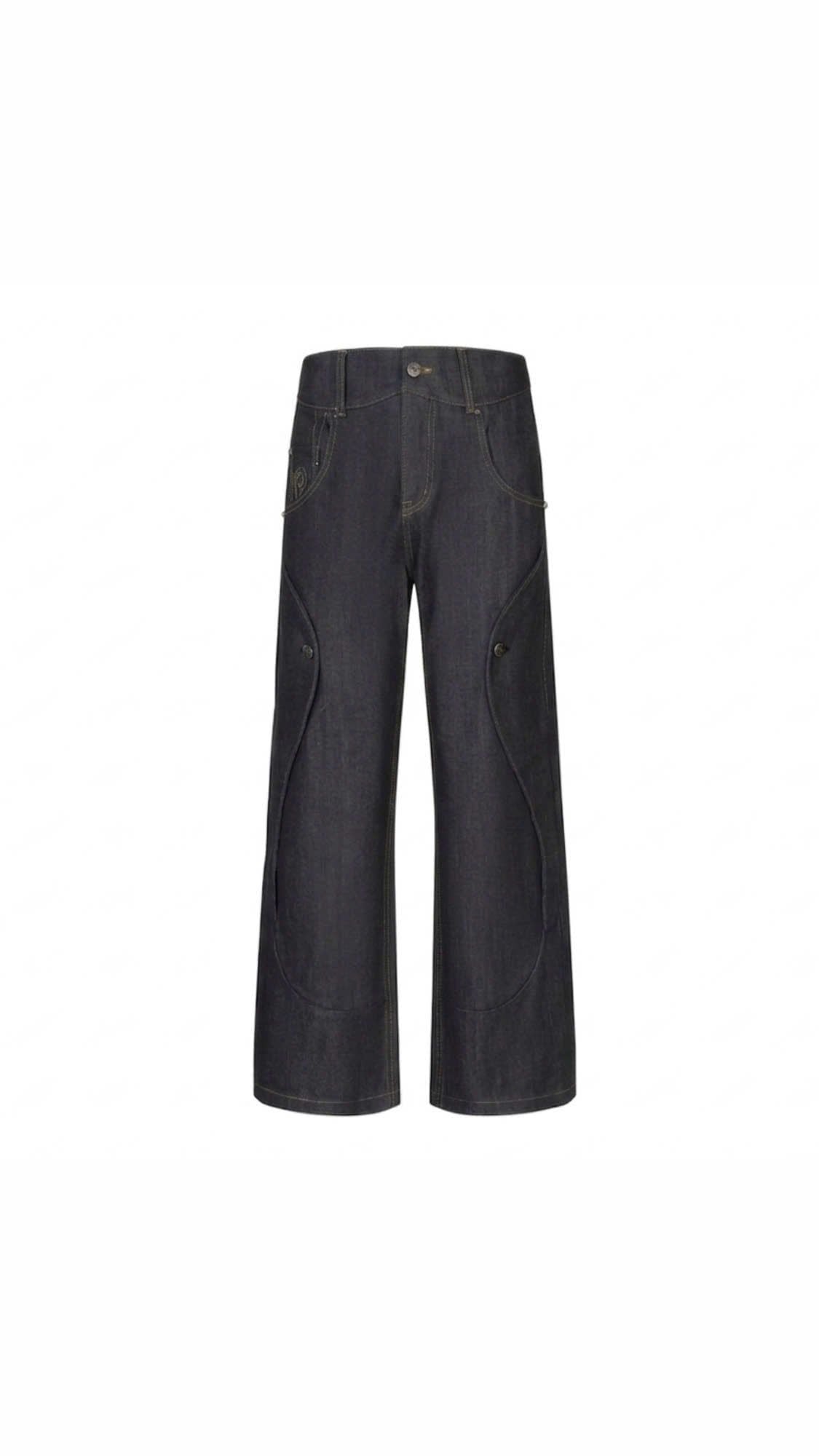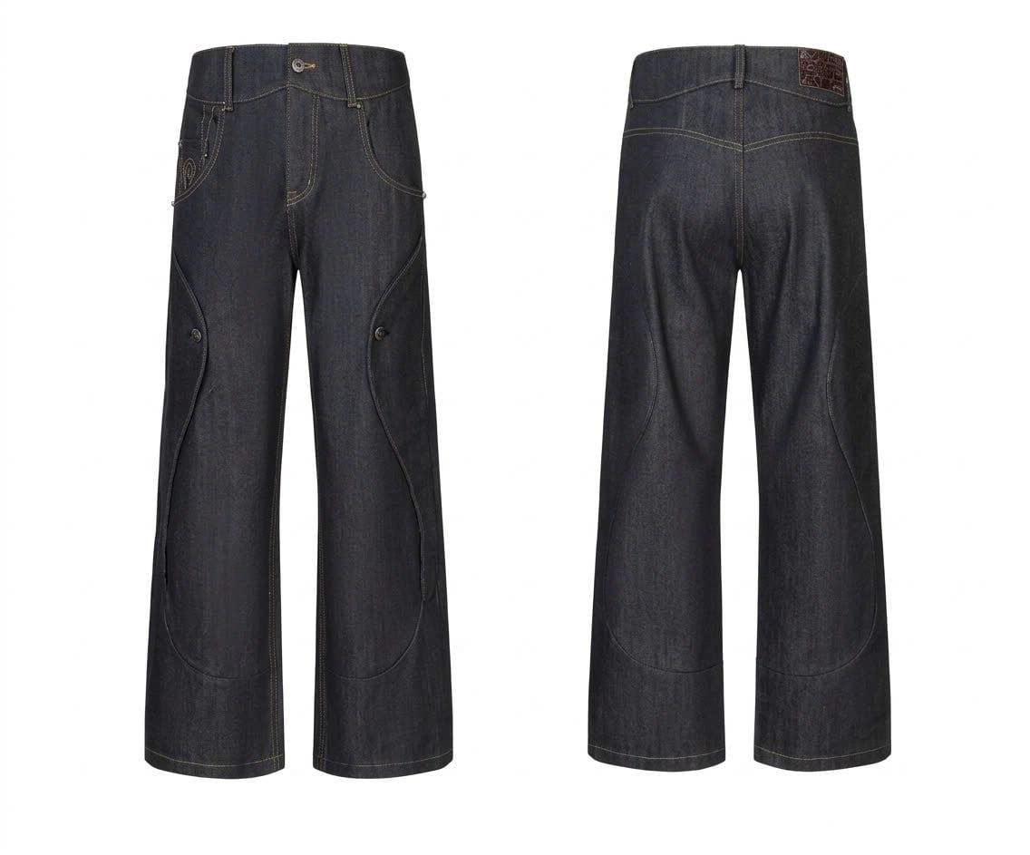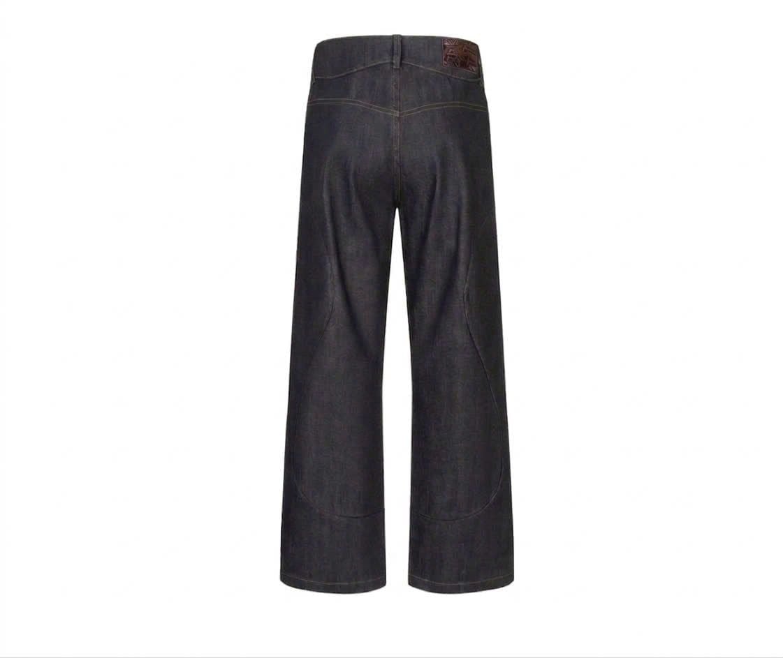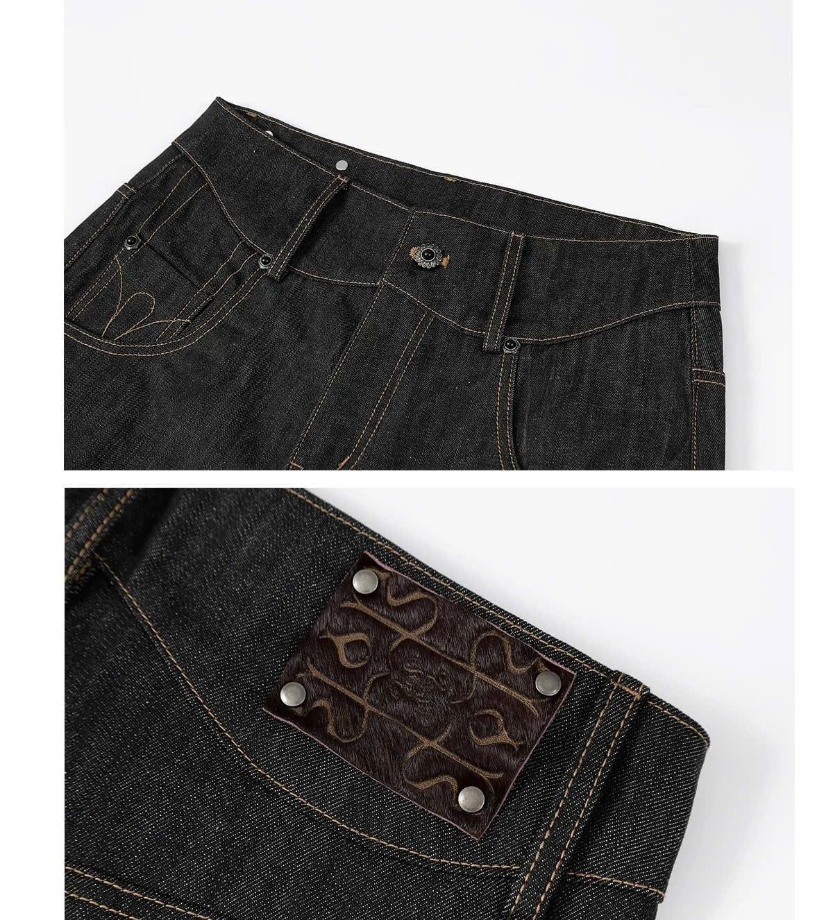 The fabric uses custom-woven 13.5oz selvedge fixed-color material, with hand-stitched seams at the pocket areas, giving a very three-dimensional and premium feel.