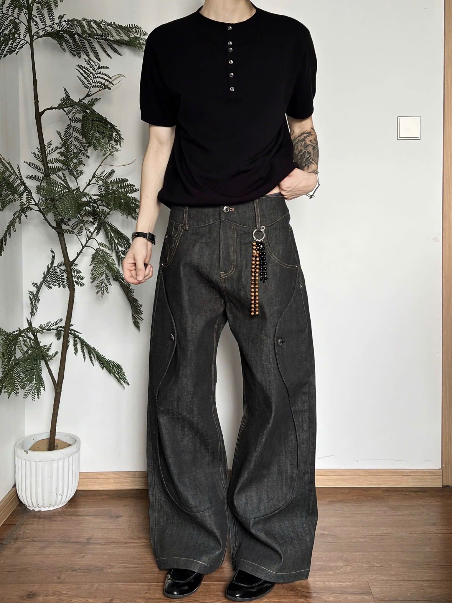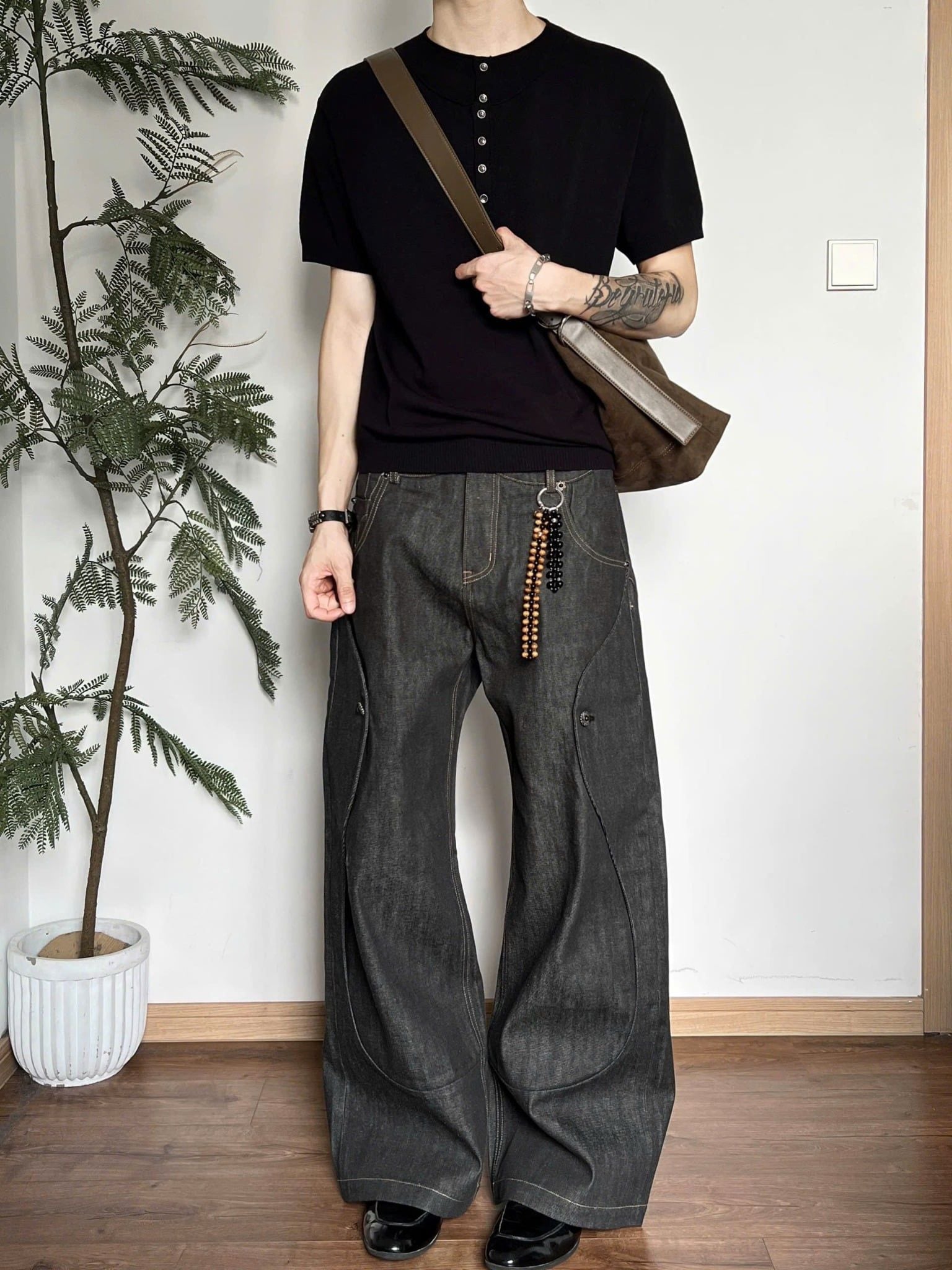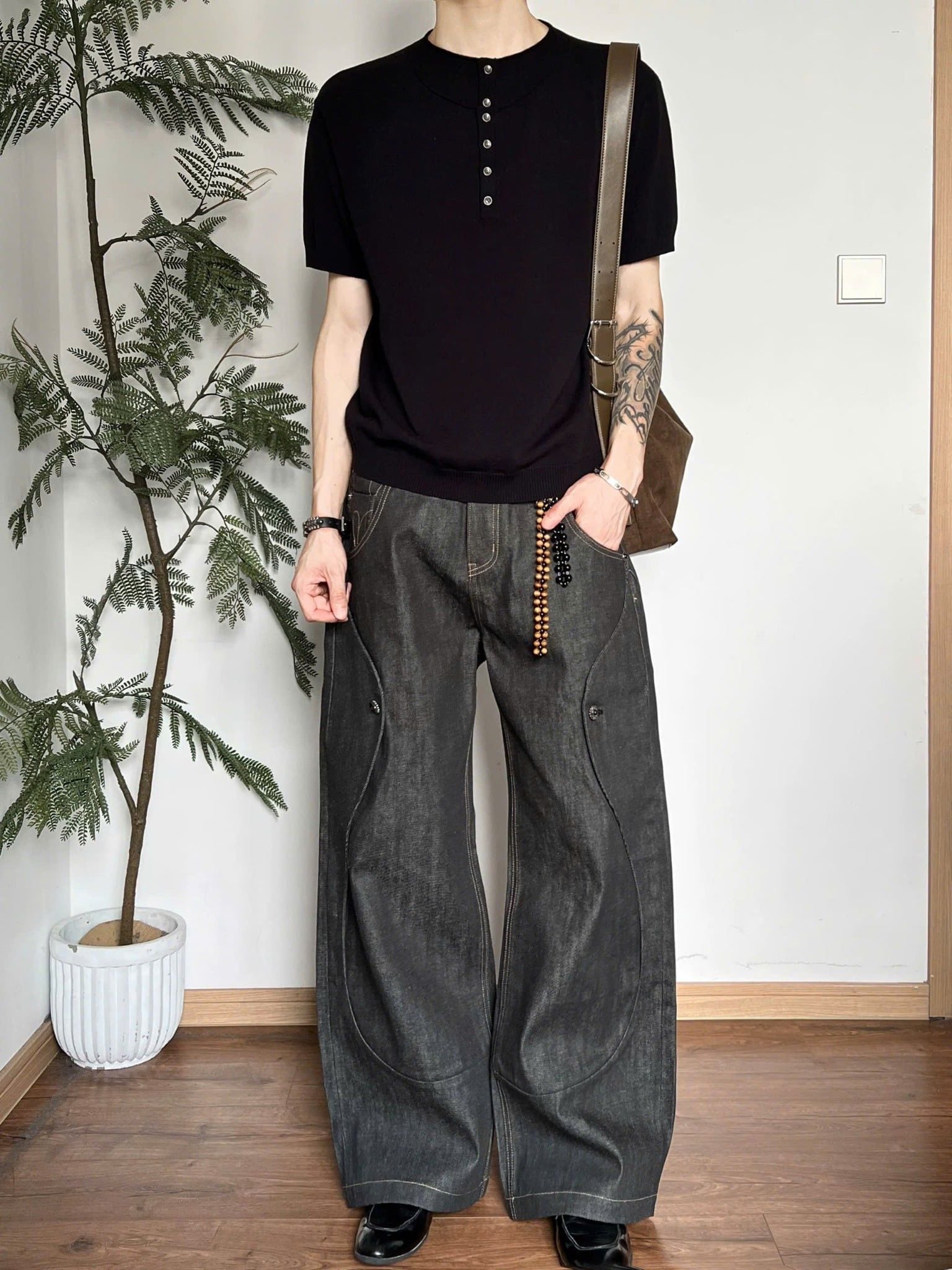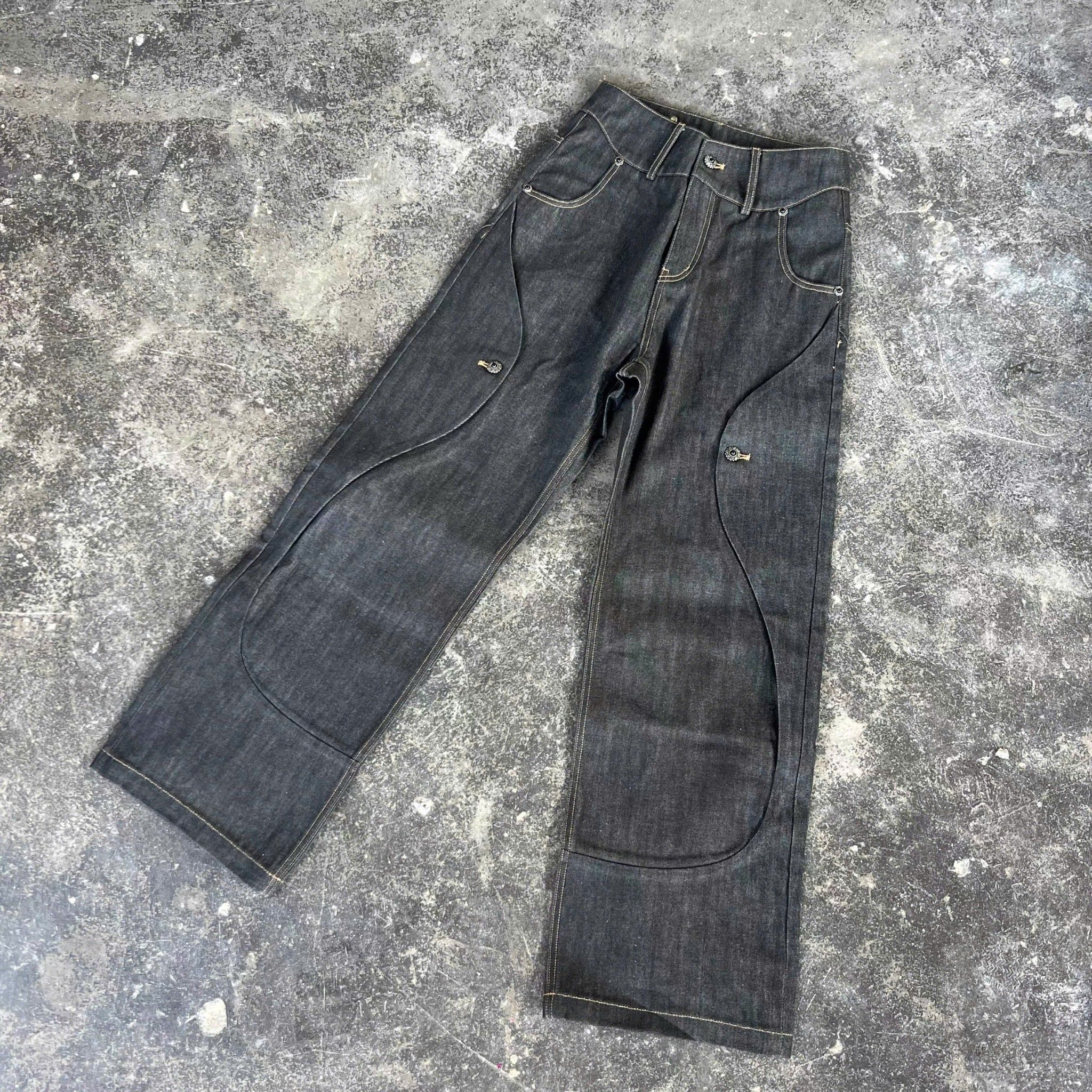 The fabric uses custom-woven 13.5oz selvedge fixed-color material, with hand-stitched seams at the pocket areas, giving a very three-dimensional and premium feel.